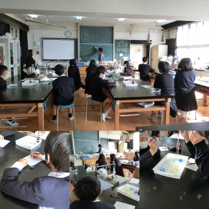 5種類の液体にBTB溶液を混ぜ、酸性→黄色、アルカリ性→青色に変化する実験を行いました。