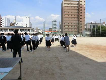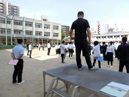 ただ、密を避けるため、グランドに集合後、校舎3階の廊下に全員が垂直避難をすることは、昨年に引き続き、行いませんでした。