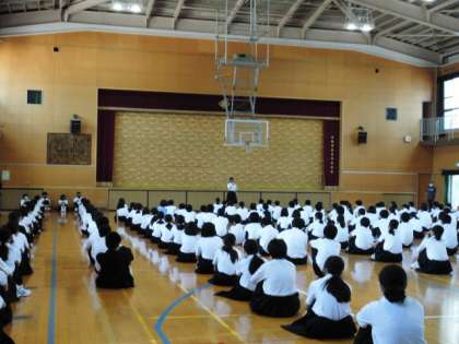 3時間目、体育館にて全校生徒が集まっての1学期終業式をおこないました。