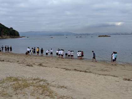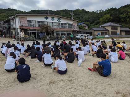 浜辺で学年集会。
