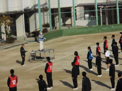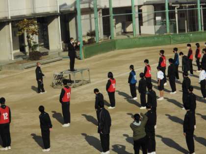 生徒のみなさんが、いつもの教室にいる時に、教頭先生から放送で地震警報の発令をききました。避難訓練のスタートです。