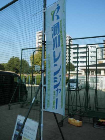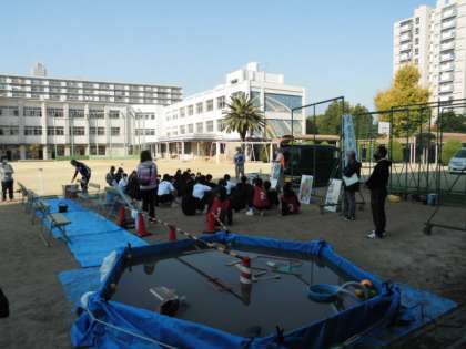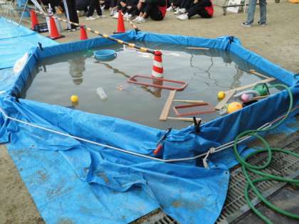 運動場では、淀川河川レンジャーさんがご用意くださった、仮想の浸水地。