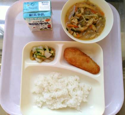 きょうの給食の「たらフライ」は、衣にパン粉、小麦粉、でんぷん、小麦たんぱく、食塩、香辛料が使われています。しっかりと味のついた衣をまとっていて、おいしく食べやすいフライです。