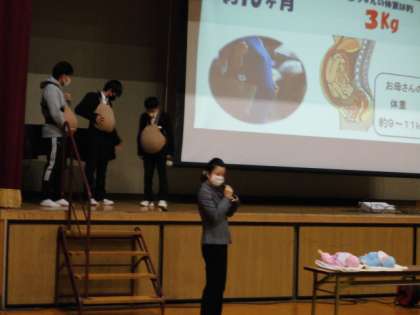 大きなお腹の妊婦さんにとって、日常の生活をすることは、どんなに大変かを体験します。赤ちゃんの小ささや重さを、人形を抱っこして実感するが出来ました。
