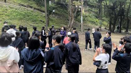 2組生徒がツリートレッキング中の1組生徒を応援していました。