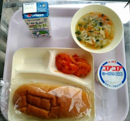 本日の給食メニューです。 えびのチリソース 中華スープ ヨーグルト 黒糖パン 牛乳