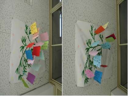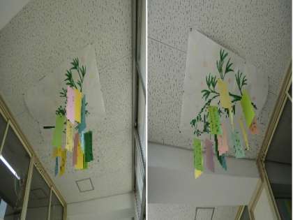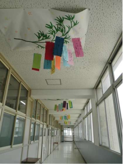 1年生の廊下です。短冊がいっぱい。みんなの願いがかないますように。