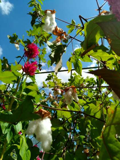 いまは、実がはじけて、中から綿(わた)がでてきました。