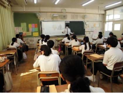 多くのベテラン先生に見守られながら、授業を行う実習生。