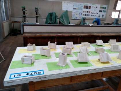 技術科の授業で作成した1年から3年までの各学年ごとの作品が展示されていました。