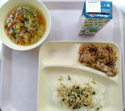 本日の給食メニューです。 豚肉のスタミナ焼き すまし汁 とりなっ葉いため ごはん 牛乳