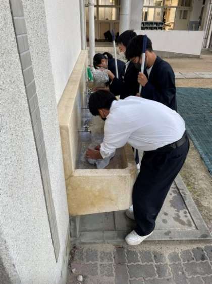 終学活の終了後すみやかに作業ができるように、お昼休憩の時間には、2年生の環境委員がワックスがけの道具を準備してくれていました。
