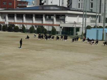 グラウンドいっぱいを使って学年全員参加の『だるまさんがころんだ』。
