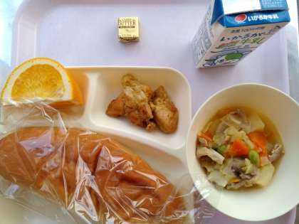 本日の給食メニューです 鶏肉のカレー風味焼き 洋風煮 はっさく コッペパン バター