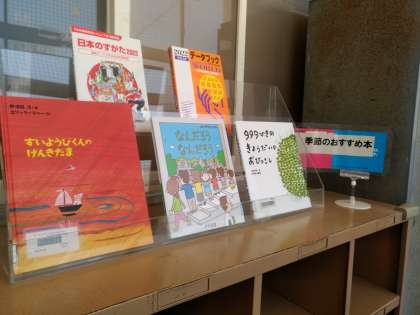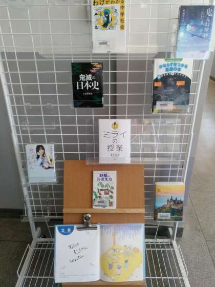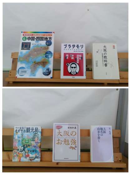 豊崎中学校の図書室では、大阪にまつわる本や、道に生える野草について、また新しいシリーズがはじまったテレビアニメに関する本などなど、いまの季節にピッタリの本を集めています。
