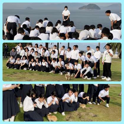 海が見えるところで、朝の集いをし、学級写真を撮影。