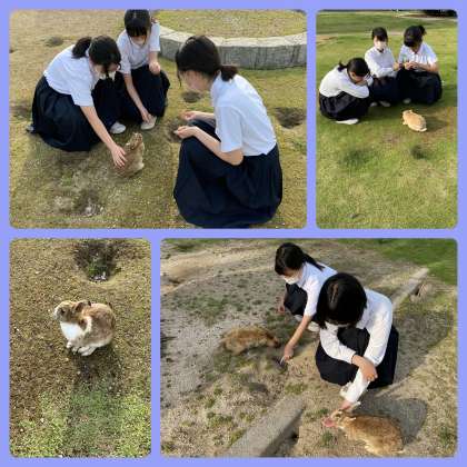 ウサギも仲間入りし写真をとっていると、休暇村に宿泊されていた方からウサギのえさを分けていただき、みんなでえさやり,ほっこりした時間を過ごしました。