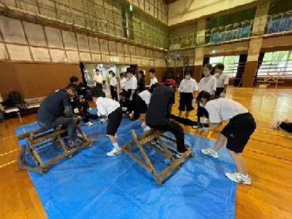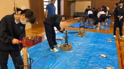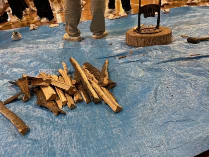 ノコギリやカナヅチを使い、火おこしの準備をしています。