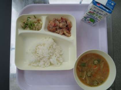 本日の給食メニューです 鶏肉のしょうゆバター焼き みそ汁 野菜いため ごはん 牛乳
