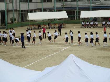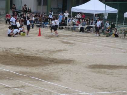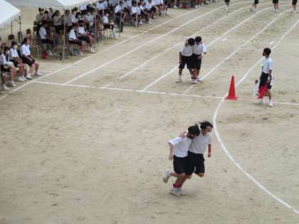 二人三脚と1年学年競技の様子です。二人三脚は息をあわせて頑張って走り、逆転劇もありました。おおなわとびの躍動感からは、普段の練習の成果がうかがえます。