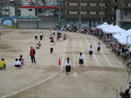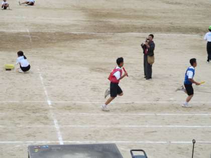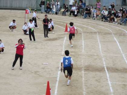 クラス対抗スウェーデンリレーの様子です。最後の種目まで全力で駆け抜けた選手達全員に、惜しみない拍手が送られました。保護者席からのがんばれの応援の声も、楽しそうな表情をした子どもたちにたくさん届いていました。