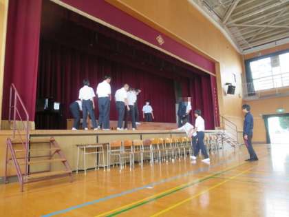 文化発表会の舞台設営を生徒たちがしてくれていました。少しふざけて先生につっこまれるなど、和気あいあいとしていてとても微笑ましい光景でした。
