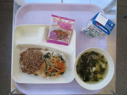 本日の給食メニューです ビビンバ わかめスープ いもけんぴフィッシュ ごはん 牛乳
