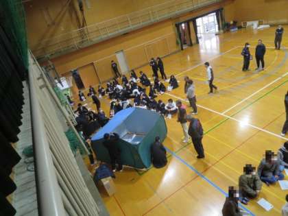 その時、その役割を果たすためには生徒みなさんの力が必要になります。今回はそのような事態を想定して、避難所を設営する訓練の事前学習を行いました。