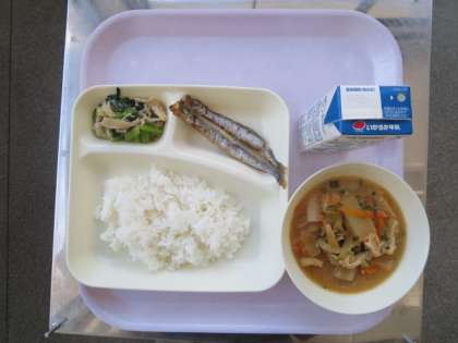 本日の給食メニューです 焼きししゃも みそ汁 こまつなのいためもの ごはん 牛乳