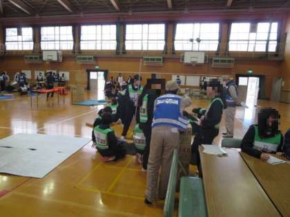 本日は、震災が起こったことを想定して避難訓練、および避難所開設訓練を行いました。先日は事前学習としてテント1つや口頭での説明でしたが、今回は全員がそれぞれの役割をこなし、避難所の開設に臨みました。