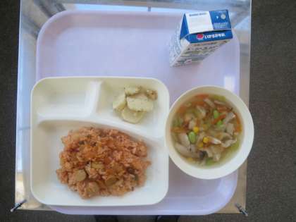 本日の給食メニューです ケチャップライス スープ じゃがいものバジル焼き ごはん 牛乳