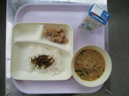 本日の給食メニューです まぐろの甘辛焼き 豚汁 くきわかめの佃煮 ごはん 牛乳