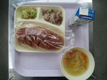 本日のメニューです 豚肉のガーリック焼き スープ ツナとキャベツのソテー 加工パン 牛乳