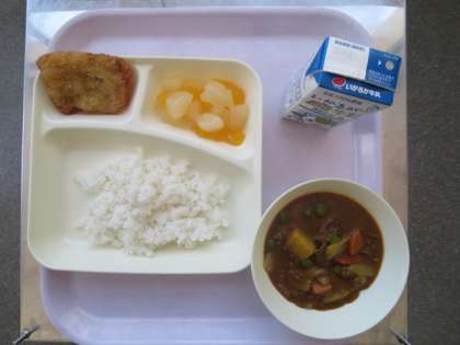 本日のメニューです カツカレーライス フルーツゼリー 牛乳