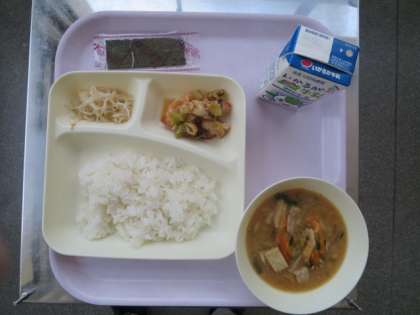 本日のメニューです 焼きとり みそ汁 もやしのゆずの香あえ 焼きのり ごはん 牛乳