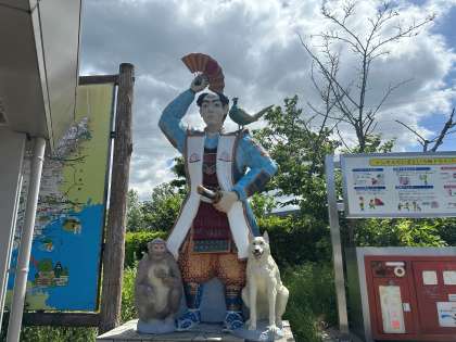 「よ〜おいでんさった(よく いらっしゃいました)」と桃太郎一行が、雨雲を払い青空を用意して豊中生を迎えてくれました。