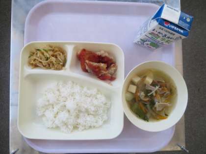 本日のメニューです。 ヤンニョムチキン 豆腐のスープ 切り干し大根のナムル ごはん 牛乳