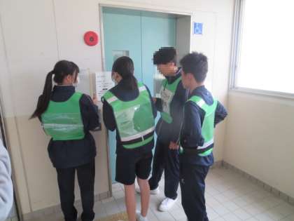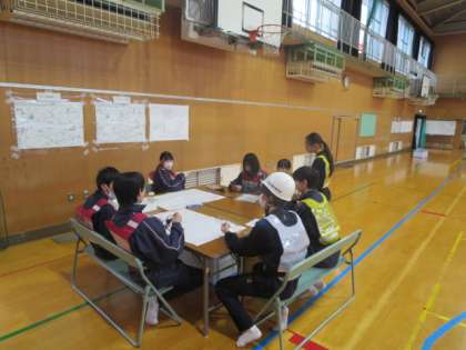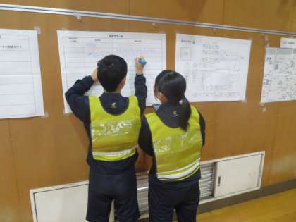 3年生は体育館で防災対策本部の開設と運営を行っていました。校内を回り、危険個所がないかを調査する班や、ニュースや調査報告を受け、それをまとめ掲示する情報班などに分かれて、それぞれが自分の仕事を一生懸命こなしていました。