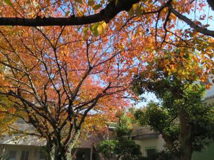 それは本館から更衣室への道中に植えられている木です。今はかなり葉が落ちてしまってその道をオレンジ色に染めています。