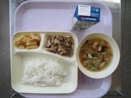 本日のメニューです。 豚肉と干しずいきのみそ煮 五目汁 焼きじゃが ごはん 牛乳