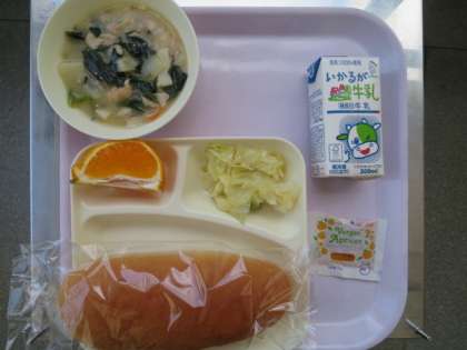 本日のメニューです。 鶏肉とほうれんそうのシチュー キャベツのサラダ デコポン