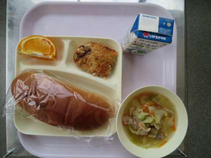 本日のメニューです。 押麦のグラタン スープ デコポン 黒糖パン 牛乳
