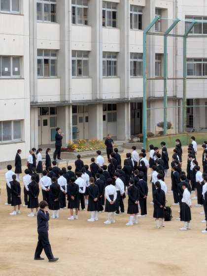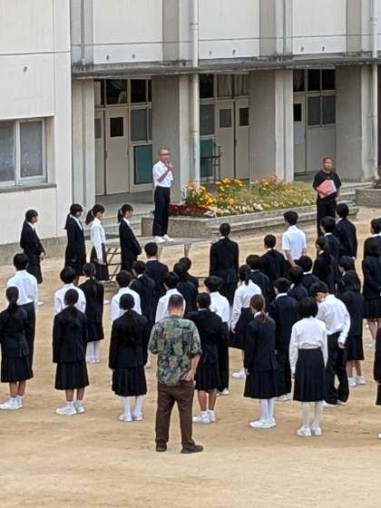 今朝の全校集会では、校長先生より「スマートフォン」や「SNS」の適切な使い方についてのお話がありました。その後、生徒会から先週の「大阪・関西万博」への校外学習の活動報告が行われました。