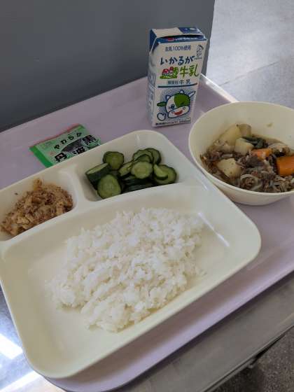 本日の給食は ごはん 牛乳 肉じゃが きゅうりの酢の物 ごまかかいため ソフト黒豆 です。