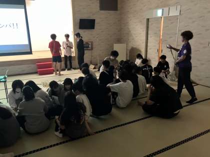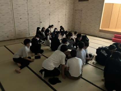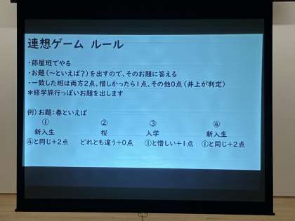 こちらは連想ゲームを楽しんでいる場面です。参加者たちは部屋班メンバーと相談しながらアイデアを出し合い、高得点を狙っています。