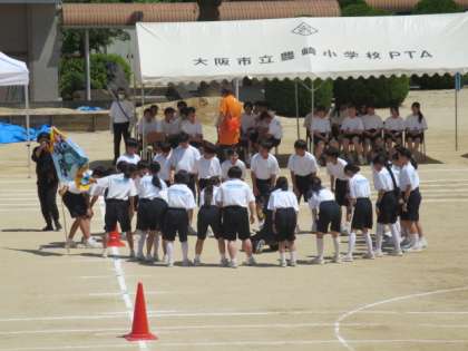 競技開始前にクラスごとに円陣を組み士気を高めます。