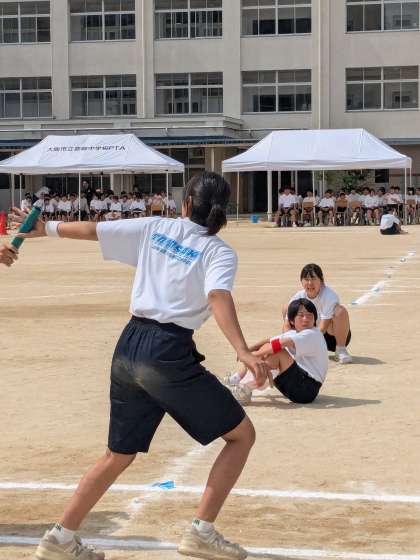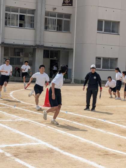 大きな歓声を受け、ランナーがバトンを受け渡しています。