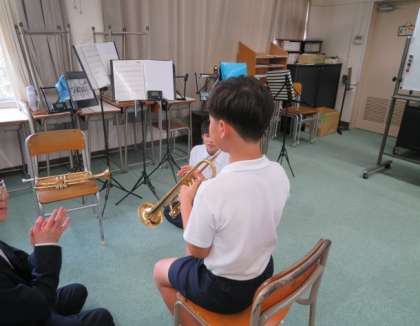 吹奏楽部では、小学生が実際に演奏の練習をしていました。
