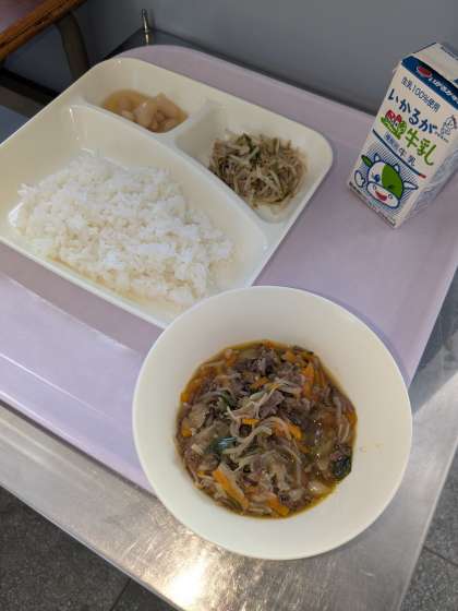 本日の給食は ごはん 牛乳 牛丼 もやしとピーマンのごまいため 大福豆の煮もの でした。