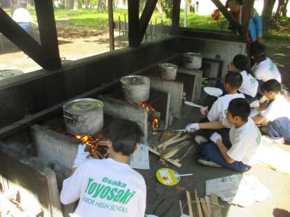 準備ができたら広場へ出て、最後のプログラムでもある「野外炊事」を行いました。